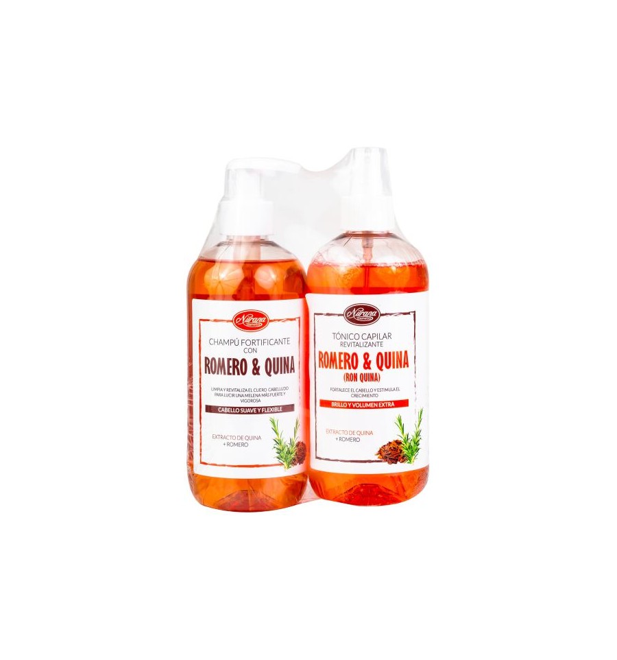 Compuesto de:- Champú fortificante con Romero y Quina que limpia y revitaliza el cuero cabelludo para lucir un cabello más fuerte y sano.- Tónico capilar revitalizante con Romero y Quina (Ron Quina) que fortalece el cabello y estimula el crecimiento dando brillo y volumen extra.