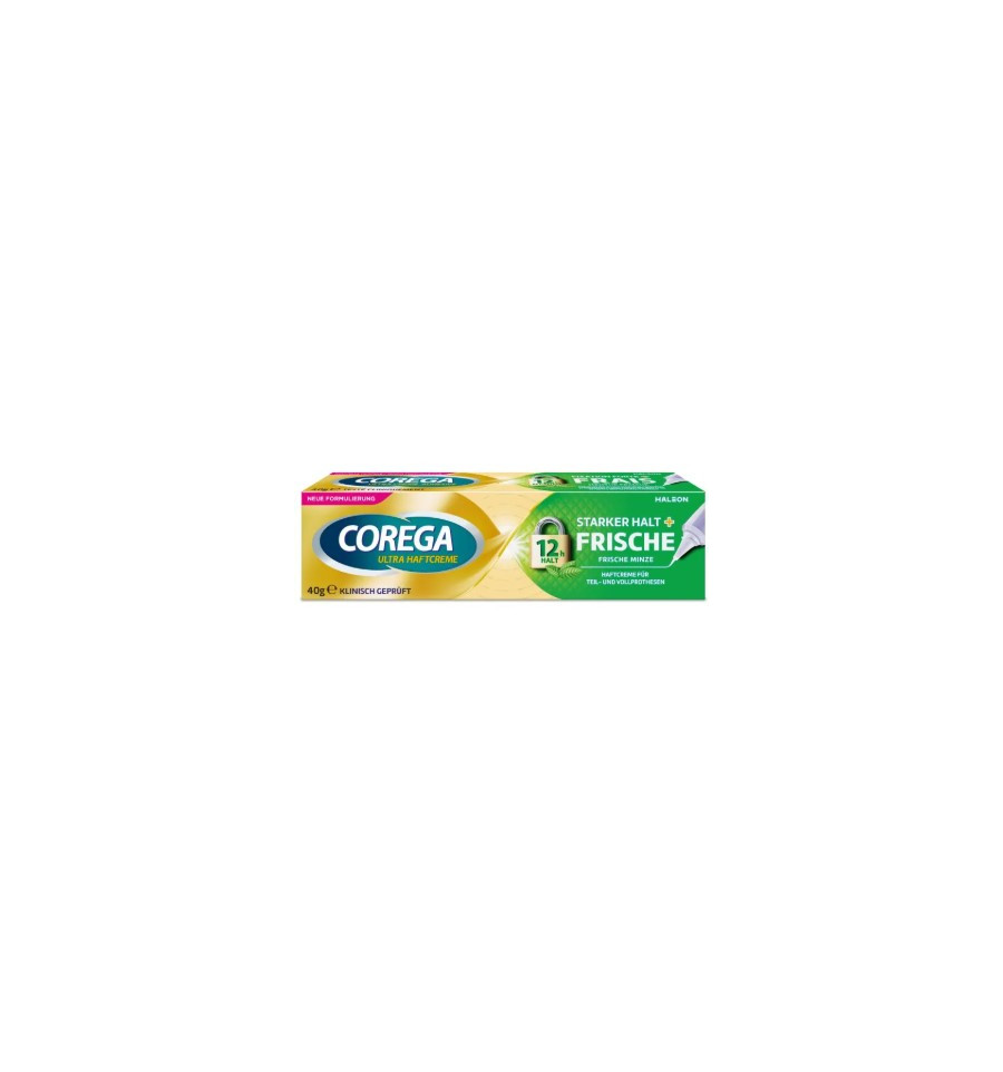 Crema adhesiva para prótesis dentales Corega Ultra para prótesis dentales completas y parciales. Esta crema adhesiva es flexible y proporciona una fijación segura durante todo el día. Su protección integral evita que se peguen residuos de comida.