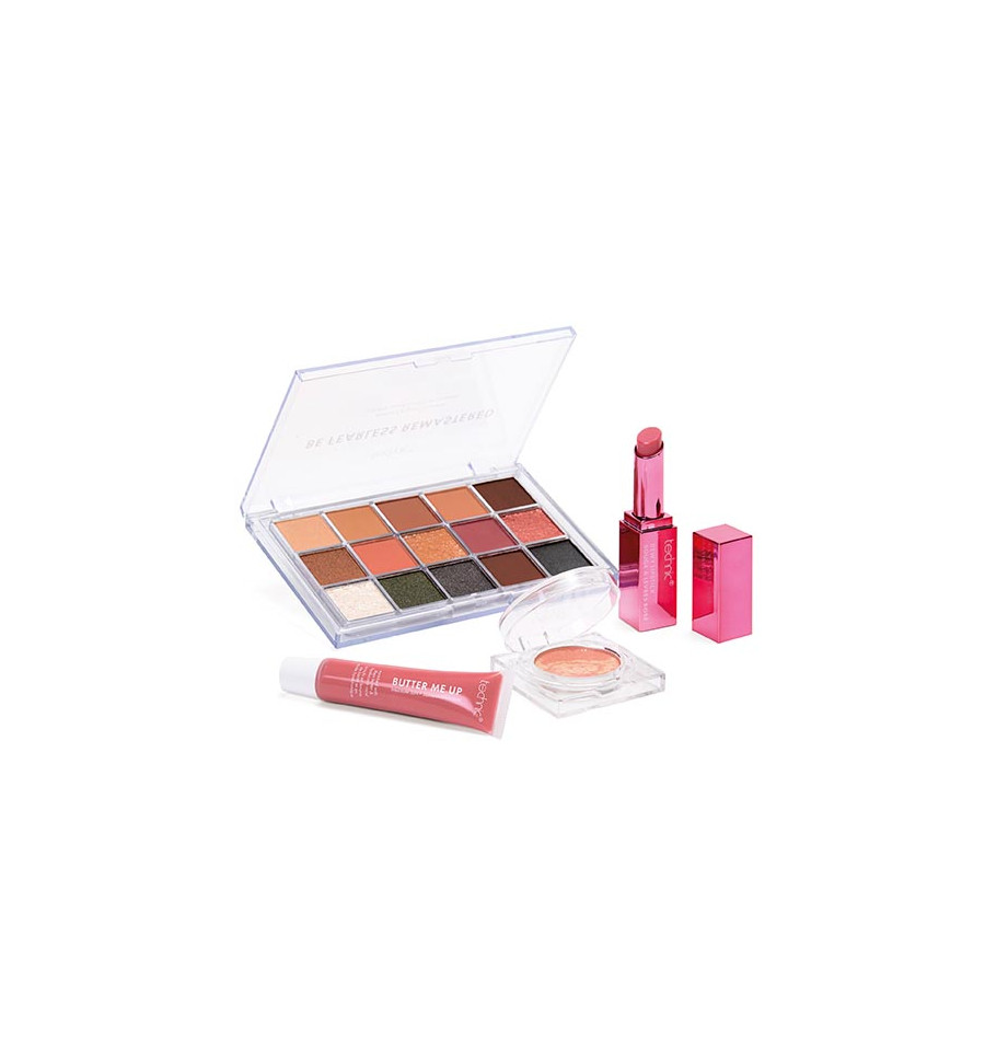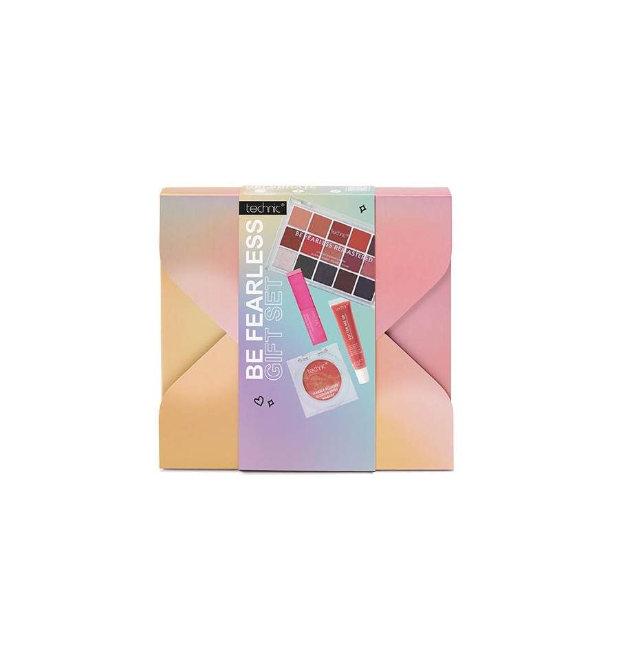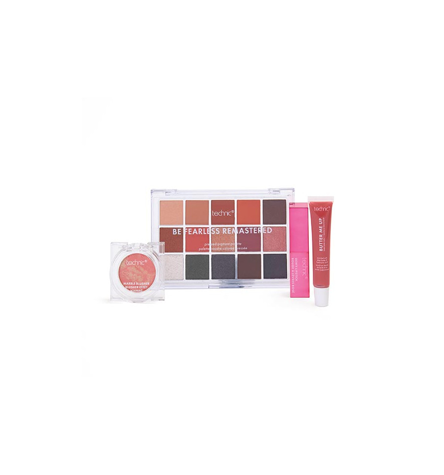 El set de regalo Be Fearless ofrece una colección de productos de belleza Technic esenciales en un set perfecto. Dentro de este versátil set, encontrarás la impresionante paleta Be Fearless, que contiene una mezcla de tonos mate, brillantes y con purpurina de alta pigmentación, desde suaves neutros hasta tonos intensos. El bálsamo de mantequilla no pegajoso proporciona una hidratación duradera para ayudar a calmar y nutrir los labios secos, dejando un sutil toque de color y brillo. El labial ligero e hidratante con efecto húmedo aporta un suave toque de color a los labios, y el colorete multitonal con efecto mármol añade un toque de color y dimensión a cualquier look.