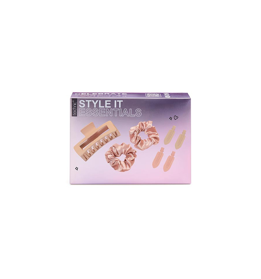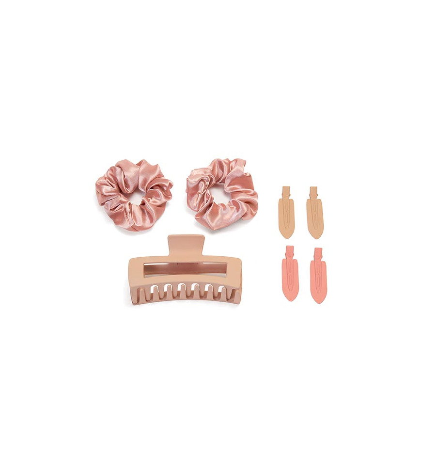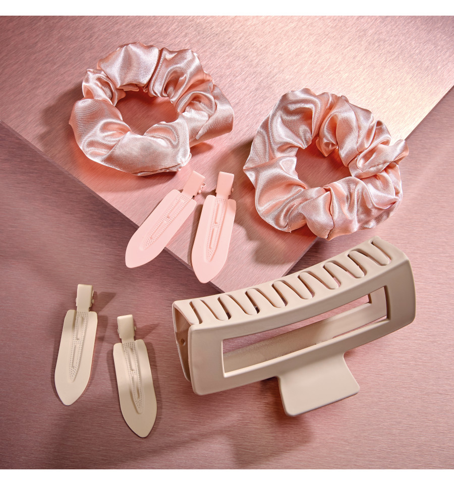 Una colección selecta de accesorios para el cabello versátiles y prácticos. Incluye una pinza de garra, perfecta para recogidos, coleteros de satén suaves para el cabello y pinzas que no dejan marcas, ideales para peinar o maquillar.