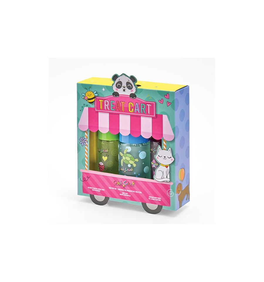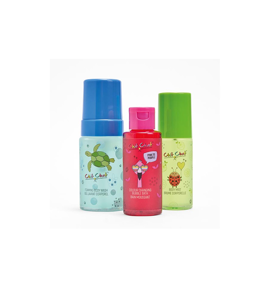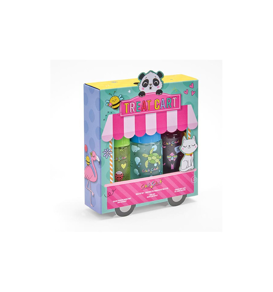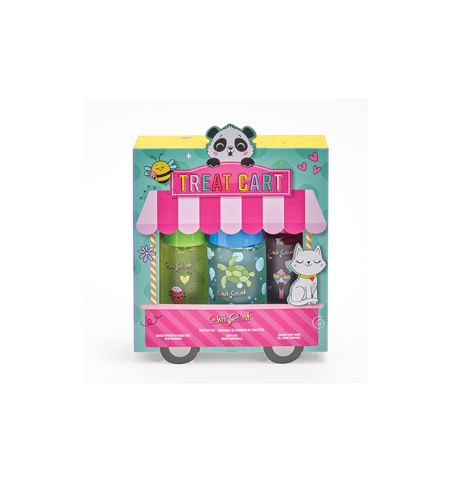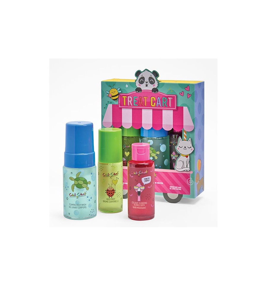 Te esperan delicias con un aroma exquisito en el carrito de golosinas Chit Chat. Contiene una bruma corporal con aroma a lima, un gel de ducha espumoso de arándanos y un baño de burbujas que cambia de color cereza para consentirte al máximo.