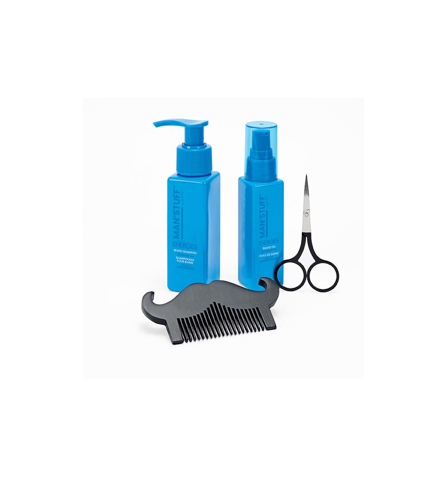 Este set para barba, el más vendido, incluye un gel limpiador y un aceite para suavizarla, ambos con aceite de menta calmante. También incluye tijeras y un divertido peine con forma de bigote para mantener tu barba cuidada.