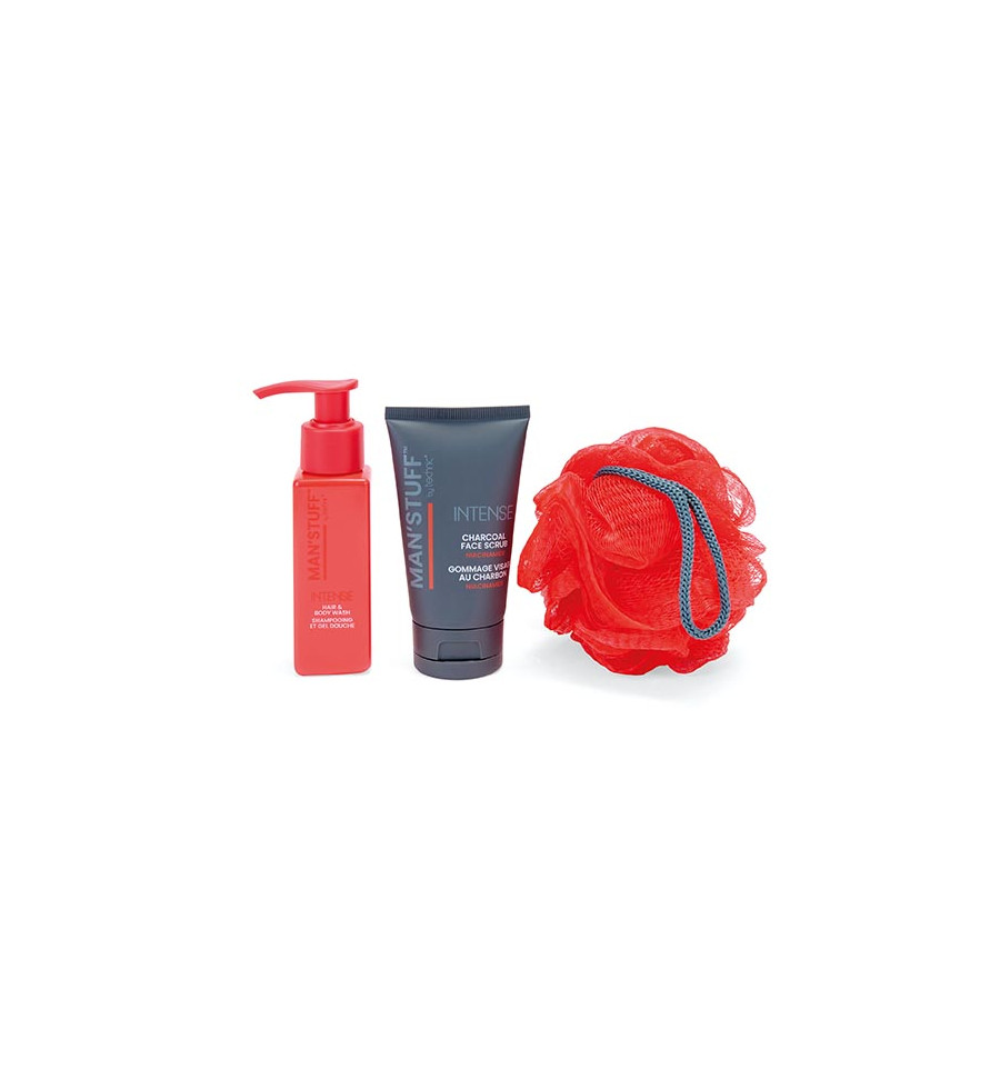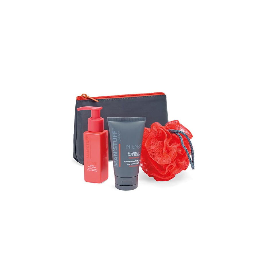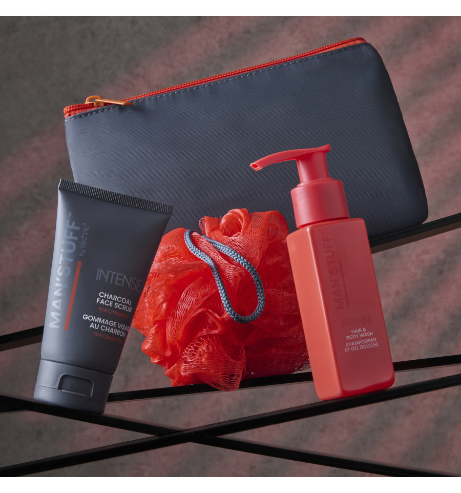 Un neceser práctico, perfecto para viajar. Contiene gel de ducha intenso para cabello y cuerpo con una rica fragancia a sándalo, además de un exfoliante facial de carbón con niacinamida y una esponja corporal.