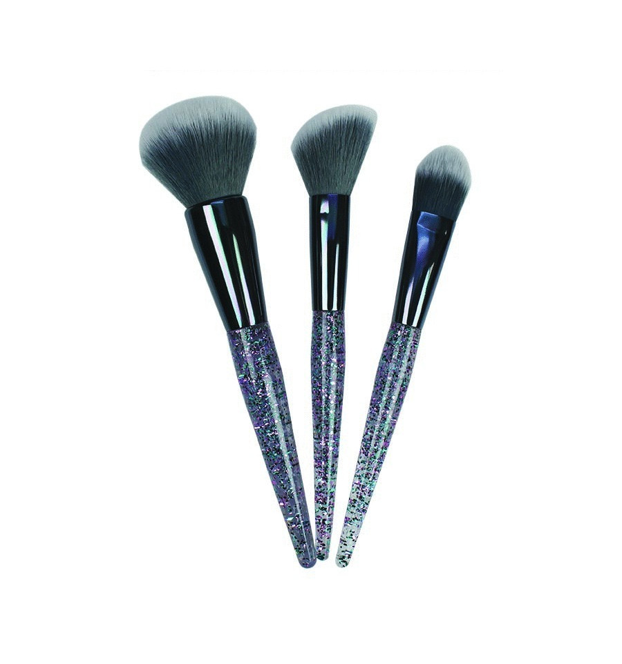 Set formado por 3 brochas faciales, colorete, maquillaje líquido y polvo.
