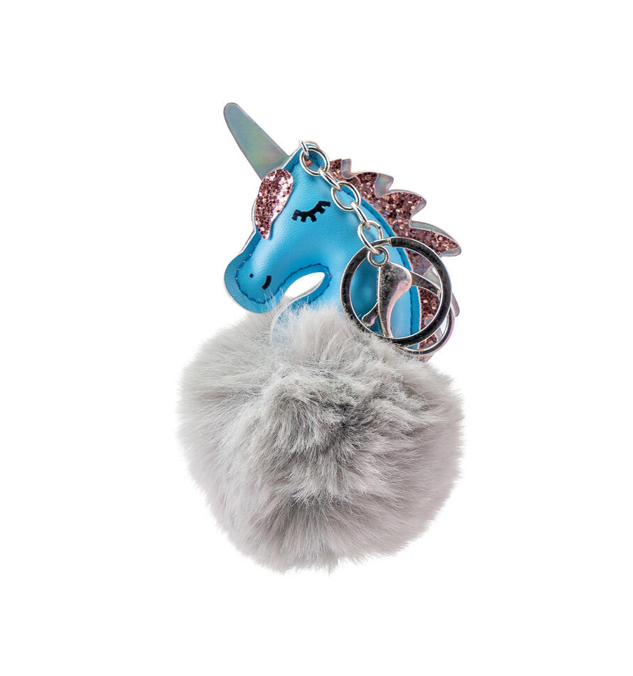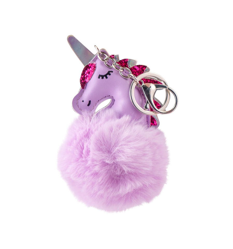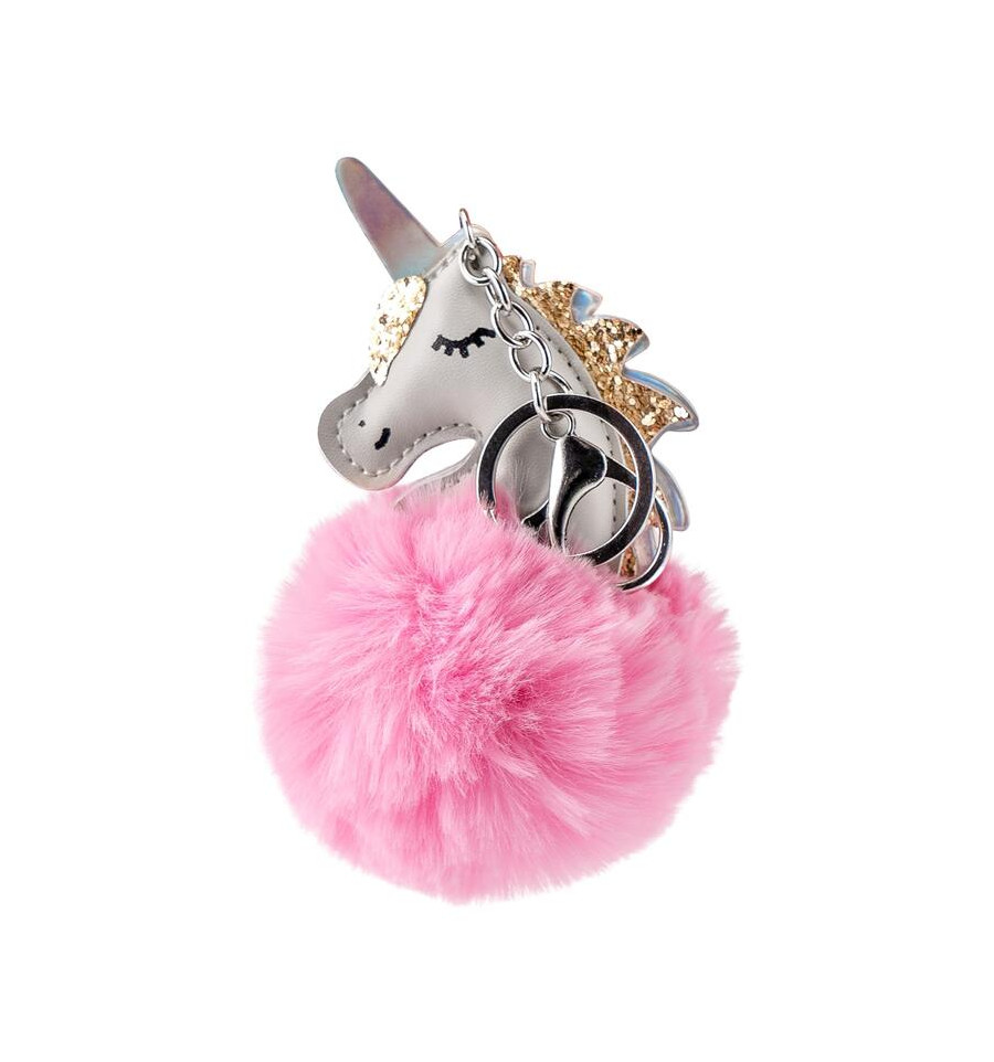 Llavero con pompón y cabeza de unicornio con purpurina. Guarda tus llaves o cuélgalo en tu mochila para un toque mágico y divertido.