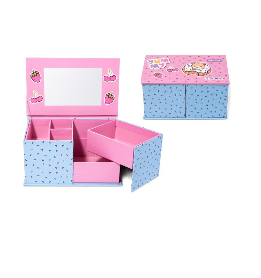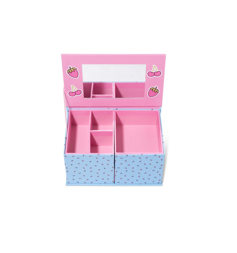 Este joyero de cartón dividido en cinco compartimentos protagonizado por un goloso gatito es ideal para guardar las joyas de los más pequeños. ¡Con espejo incorporado!