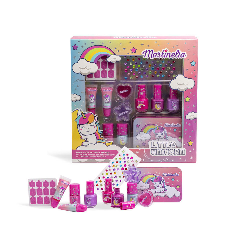 ¡Descubre la magia del maquillaje con MARTINELIA LITTLE UNICORN NAILS & LIP SET WITH TIN BOX! este encantador set incluye cinco esmaltes de uñas, dos brillos labiales, dos brillos labiales en tarro, plantillas y gemas adhesivas, todo empaquetado en una hermosa caja metálica reutilizable. Perfecto para los pequeños artistas, este set les permite explorar su creatividad y estilo personal mientras se divierten. Cada día es una nueva oportunidad para brillar y jugar con un toque de magia. ¡Haz que su rutina de belleza sea tan mágica como ellos!