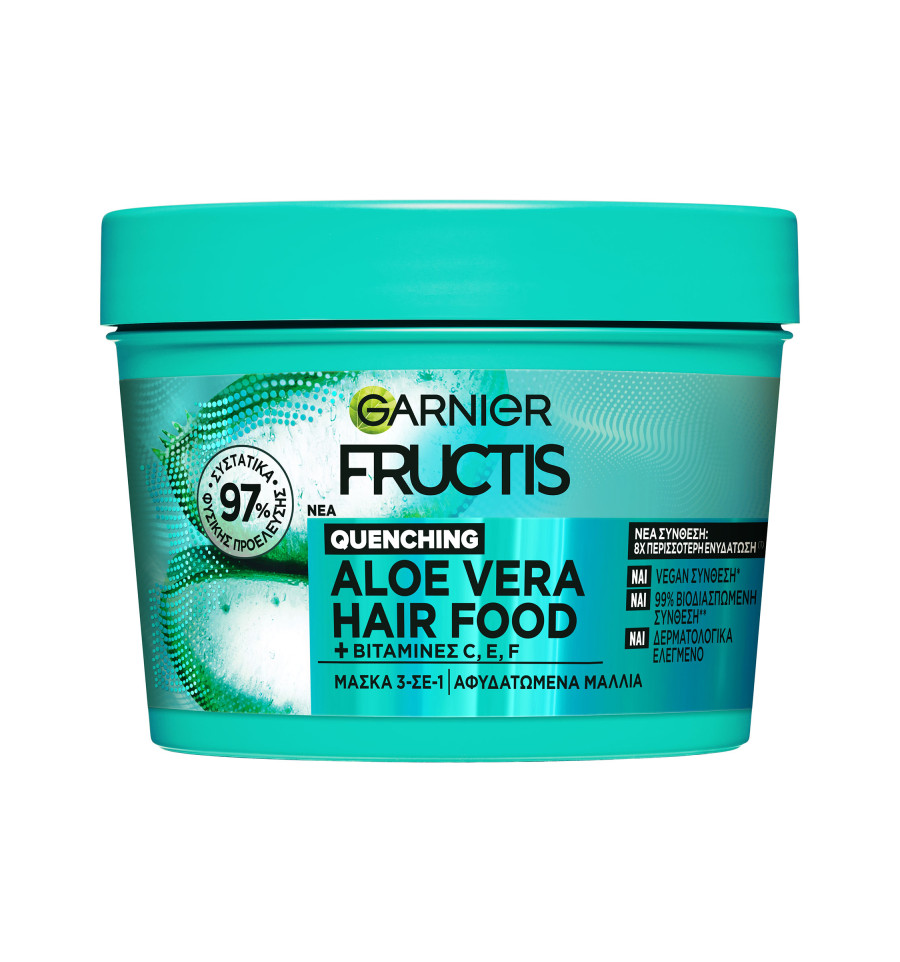 Enriquecida con Aloe Vera y vitaminas C, E, F la mascarilla 3en1 ALOE VERA HAIR FOOD promete 8 veces más hidratación del cabello deshidratado.