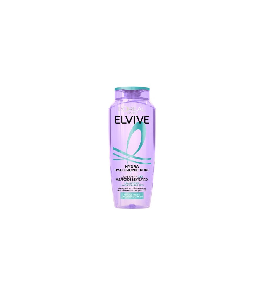 Inspirado en el cuidado de la piel, el champú Elvive Hydra Hyaluronic Pure está diseñado por expertos con una mezcla de ácido salicílico y ácido hialurónico para eliminar hasta el 100 % de los residuos, lo que permite tratar las raíces grasas y priorizar la hidratación del cabello. Deja el cuero cabelludo limpio y fresco .