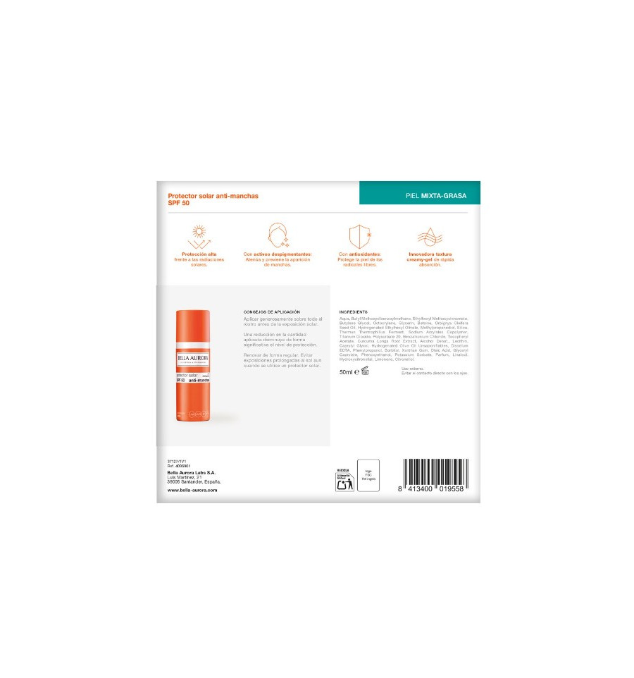 BELLA AURORA PROTECTOR SOLAR ANTIMANCHAS SPF 50 PIEL MIXTA-GRASA 50 ml + NECESER
