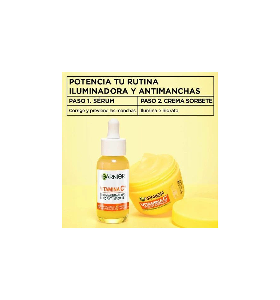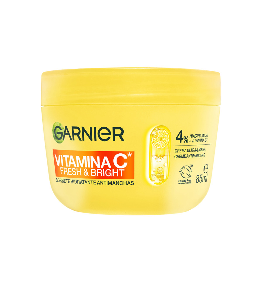 La crema hidratante antimanchas Vitamin C Fresh & Bright Sorbete de Garnier es un producto que ofrece hidratación avanzada y combate las manchas oscuras en la piel. Tiene una textura ultraligera y fresca que se absorbe rápidamente, proporcionando hidratación durante 24 horas sin dejar sensación pegajosa o grasa. Este producto ha sido clínicamente probado para iluminar la piel y puede reducir las manchas oscuras en un 47% en una semana. También ayuda a controlar la grasa durante el día. Está formulada para el cuidado de la piel femenina.