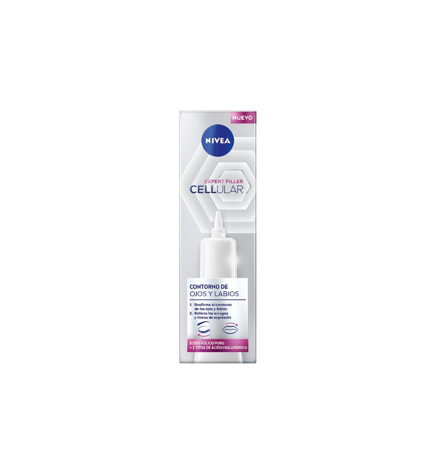 NIVEA Cellular Expert Filler Contorno de Ojos y Labios está enriquecido con Ácido Fólico puro y dos tipos de Ácido Hialurónico, poderosos activos antiedad que aportan un efecto rellenador en 24 horas*. Reafirma el contorno de ojos y labios y rellena las arrugas y líneas de expresión. El Ácido Fólico puro aporta nueva vida a las células de la piel y ayuda a reparar sus fibras*, promoviendo una piel más firme y rellena.