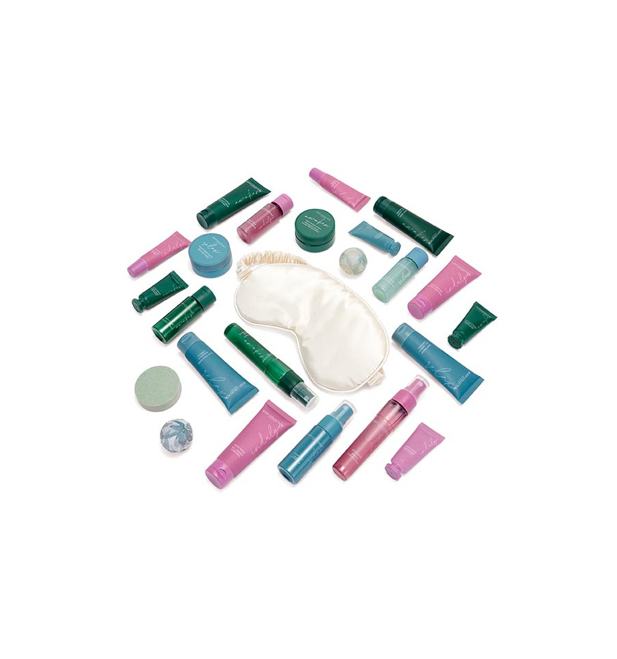 1 exfoliante de manos (25 ml) 1 bálsamo labial (7,5 g) 1 exfoliante labial (7,5 g) 3 cremas de manos (5 ml) 1 bálsamo para cutículas (5 ml) 1 exfoliante de azúcar de karité (20 g) 1 mascarilla facial de arcilla (25 ml) 3 jabones corporales (25 ml) 1 manteca corporal (25 ml) 2 efervescentes de baño (15 g) 1 vaporizador de ducha (20 g) 1 sales de baño para pies (20 g) 3 espumas de baño (20 ml) 1 bruma para dormir (20 ml) 2 brumas corporales (25 ml) 1 antifaz para ojos